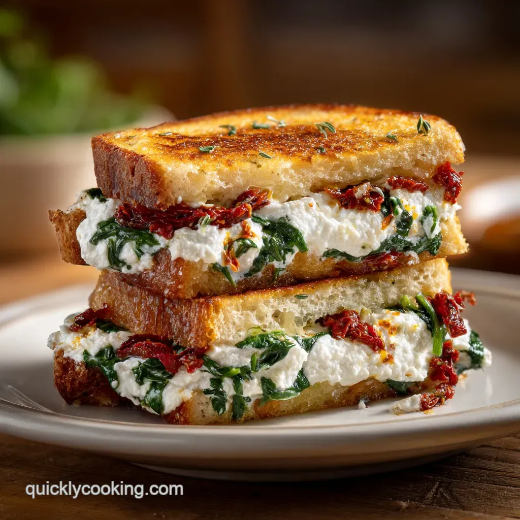 The resting phase is actually the most important step for the Dried Tomato Spinach and Ricotta Grilled Cheese with Sourdough Bread. If you cut it immediately, the ricotta hasn't had time to "grip" the spinach, and it will slide right out.